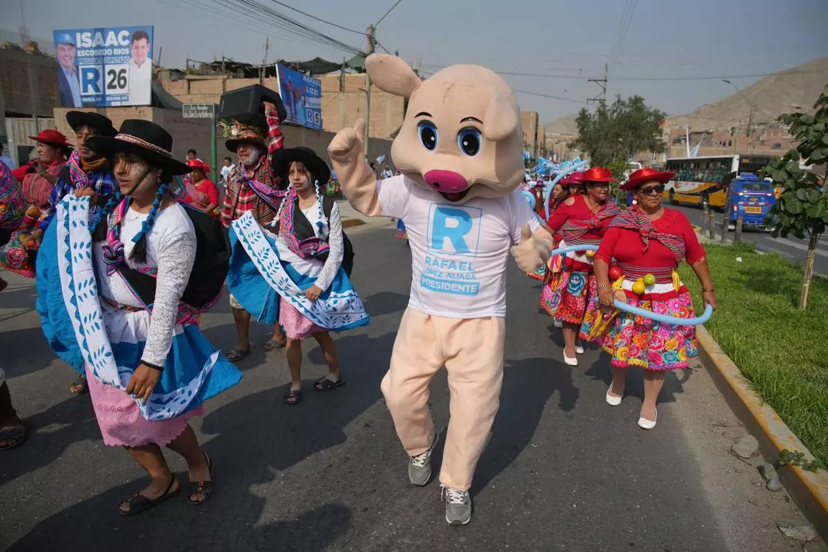 Supporters of presidential candidate Rafael López Aliaga, of the Popular Renewal party, dance as they arrive at a campaign rally in the Manchay neighborhood of Lima, Peru, Saturday, April 4, 2026. (AP Photo/Martin Mejia)