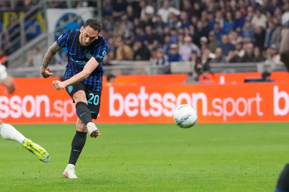 Inter Milan's Hakan Calhanoglu scores his side's second goal during the Serie A soccer match between Inter Milan and Roma in Milan, Italy, Sunday, April 5, 2026. (AP Photo/Luca Bruno)