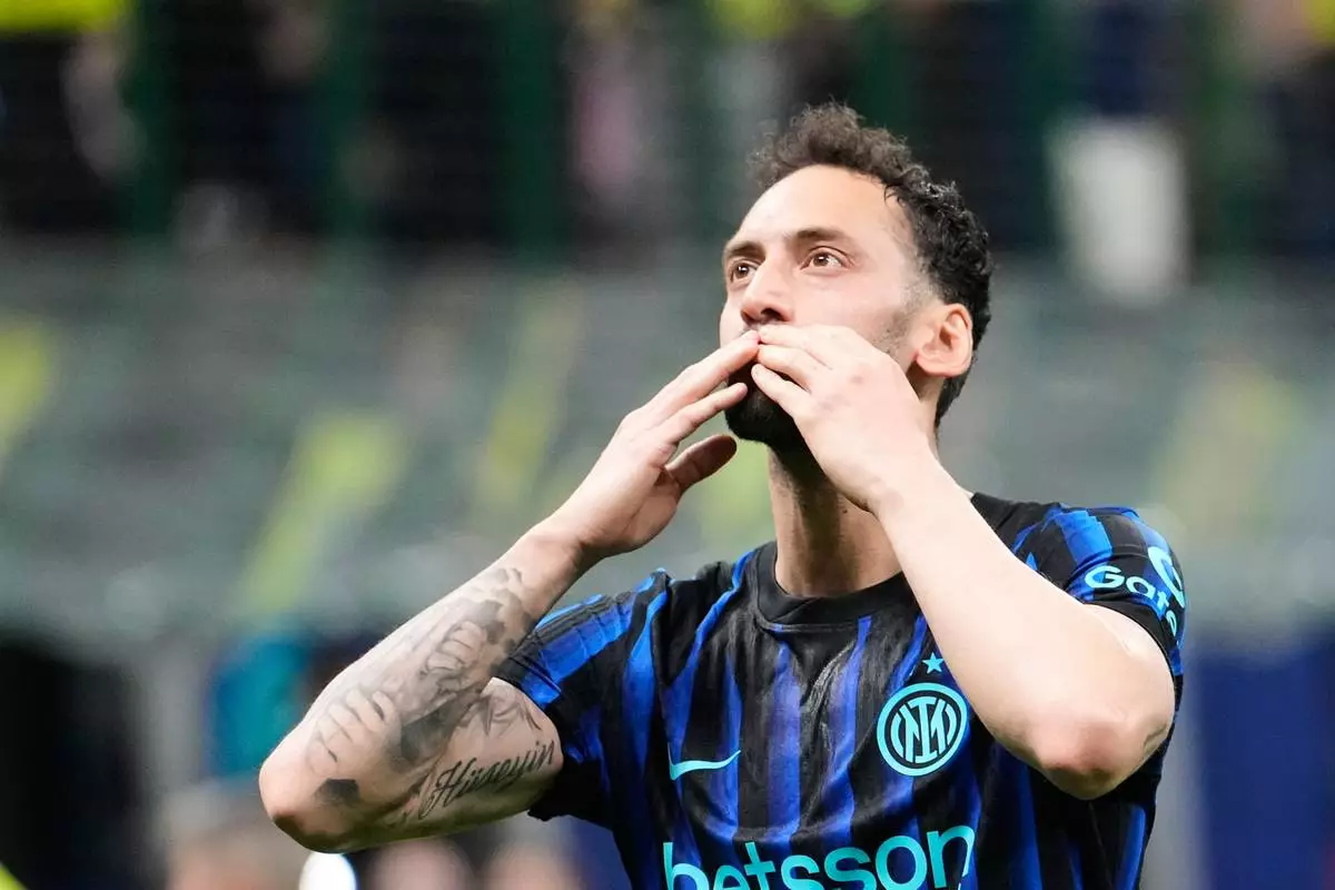 Inter Milan's Hakan Calhanoglu celebrates after scoring his side's second goal during the Serie A soccer match between Inter Milan and Roma in Milan, Italy, Sunday, April 5, 2026. (AP Photo/Luca Bruno)