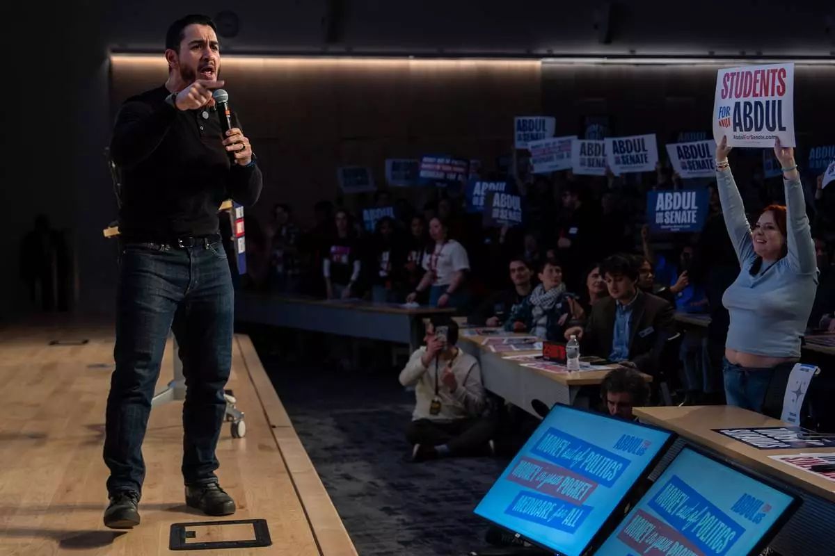 Abdul El-Sayed, a progressive candidate in the Democratic primary for U.S. Senate in Michigan, speaks at a campaign event, Tuesday, April 7, 2026, at the University of Michigan in Ann Arbor, Mich. (AP Photo/Julia Demaree Nikhinson)