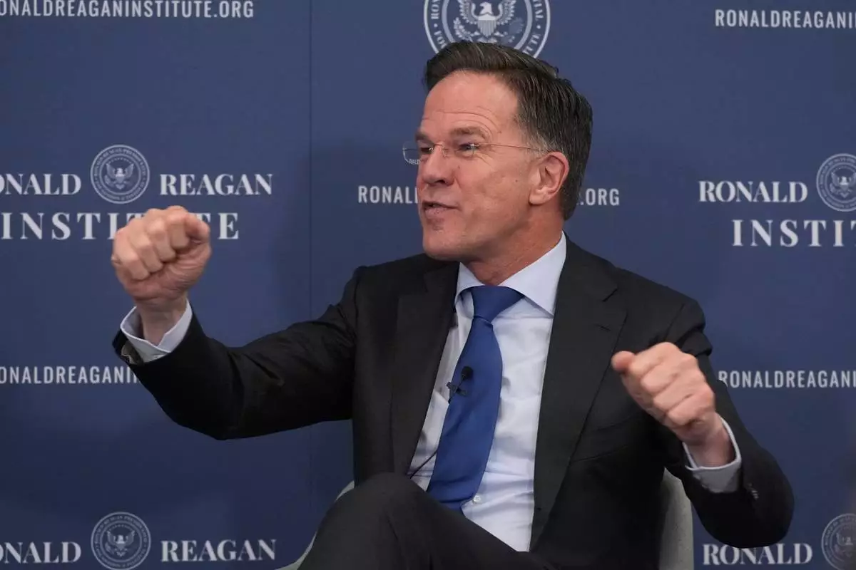 NATO Secretary General Mark Rutte speaks at the Ronald Reagan Institute, Thursday, April 9, 2026, in Washington. (AP Photo/Manuel Balce Ceneta)