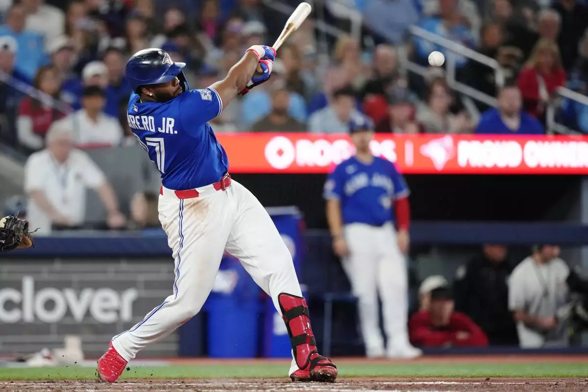 Toronto Blue Jays' Vladimir Guerrero Jr. (27) hits a ground ball against the Los Angeles Dodgers during the sixth inning of an MLB baseball game in Toronto on Tuesday, April 7, 2026. (Nathan Denette/The Canadian Press via AP)