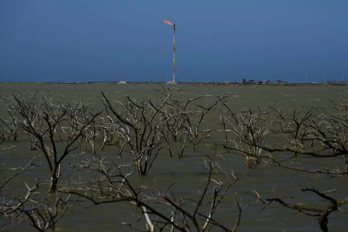 A gas company operates near submerged trees in Manaure, Colombia, Thursday, Feb. 6, 2025. (AP Photo/Ivan Valencia)