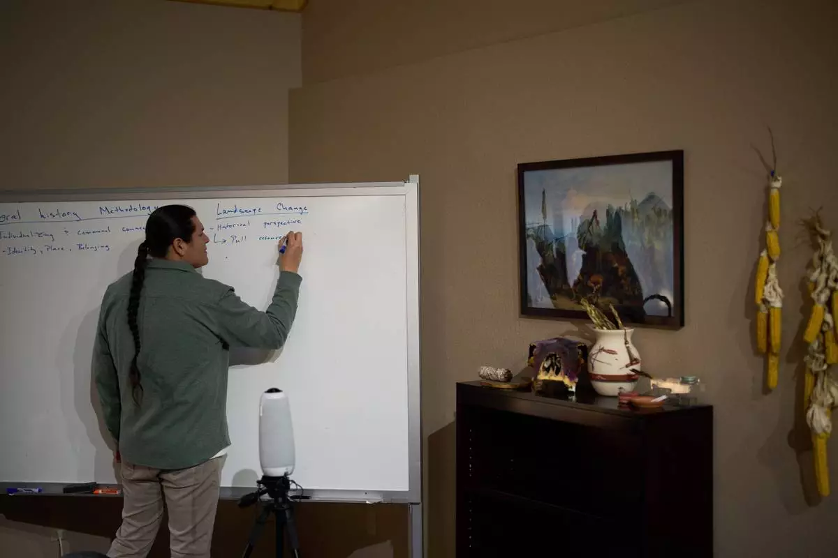 FILE - Mike Barthelemy, Native American studies director at Nueta Hidatsa Sahnish College, writes on a whiteboard during a class Thursday, Oct. 30, 2025, in New Town, N.D. (AP Photo/John Locher, File)