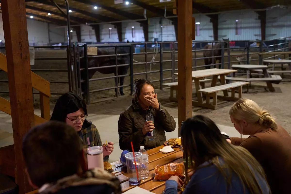 FILE - Jessee Vigen laughs as she eats with fellow students during a class in the Nueta Hidatsa Sahnish College equine studies program at the Healing Horse Ranch, Wednesday, Oct. 29, 2025, in Parshall, N.D. (AP Photo/John Locher, File)