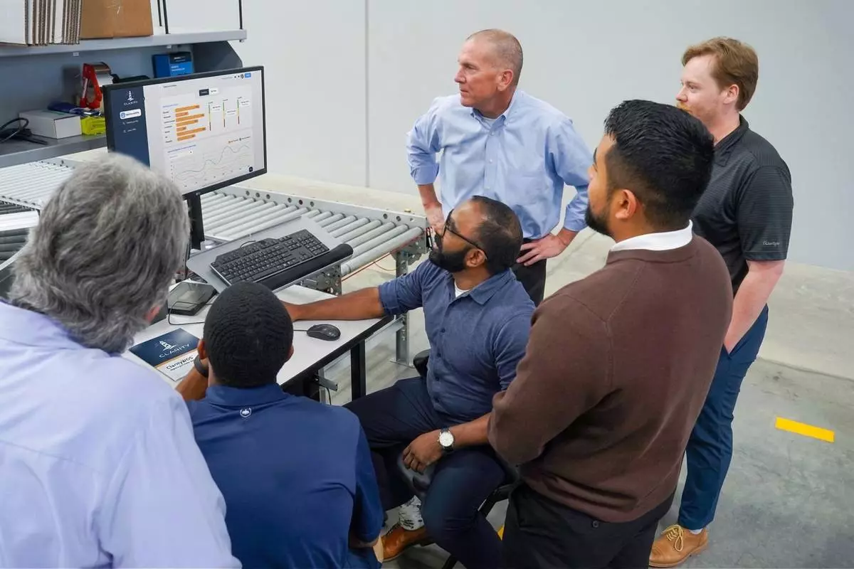 Executives and warehouse operations managers review real-time facility performance using ClarityWOS™ (Warehouse Operating System). The platform provides crucial, moment-by-moment visibility into key performance indicators (KPIs), enabling data-driven decision-making for inventory management, labor allocation, and overall operational efficiency.