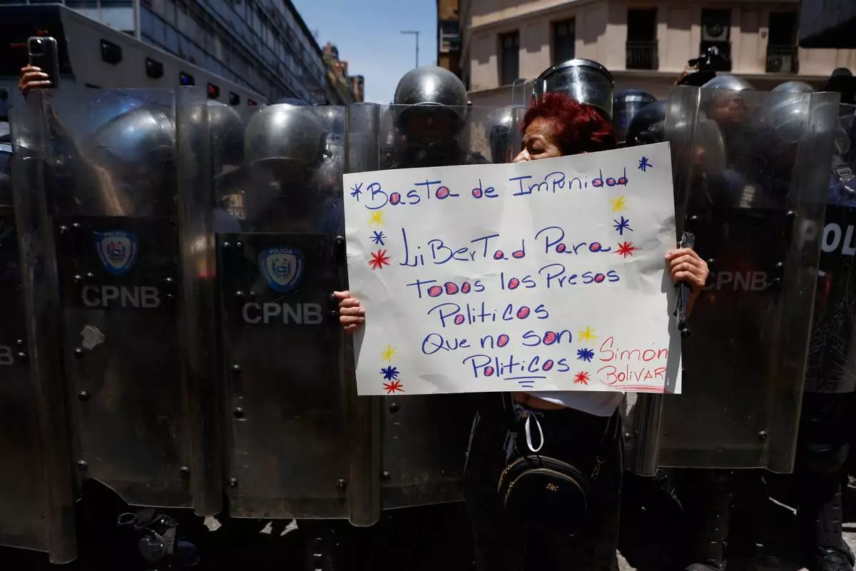 A protester holds up a sign demanding freedom for all political prisoners as she stands in front of a cordon of Bolivarian National Police, during a march demanding higher salaries, pensions and benefits, in Caracas, Venezuela, Thursday, April 9, 2026. (AP Photo/Pedro Mattey)
