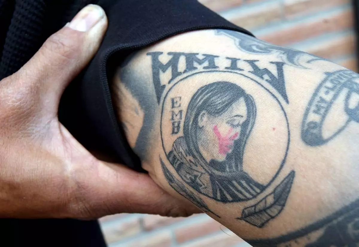 Gerald Begay, whose mother Ella Mae Begay went missing from her home, shows his Missing and Murdered Indigenous Women tattoo at his home in Denver, April 2, 2026. (AP Photo/Thomas Peipert)