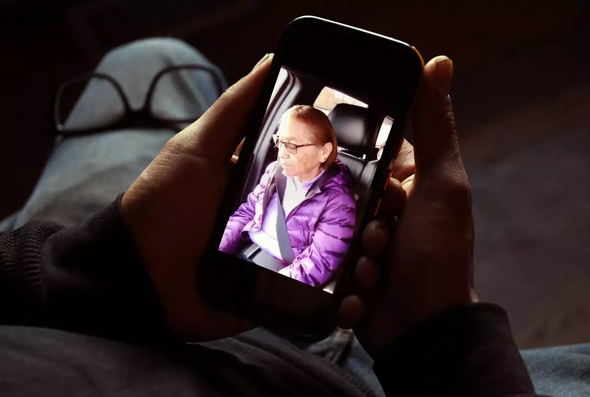 Gerald Begay, whose mother Ella Mae Begay went missing from her home, shows a photo of her on his phone in Denver, Thursday, April 2, 2026. (AP Photo/Thomas Peipert)