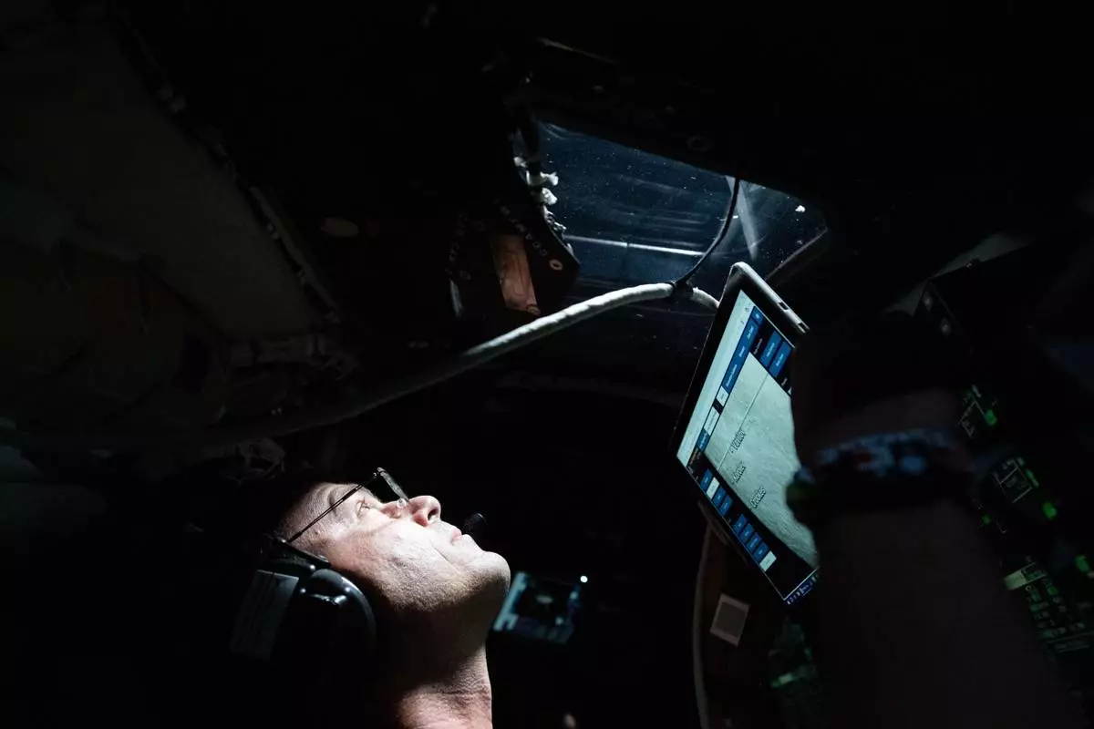 This image provided by NASA, astronaut and Artemis II Commander Reid Wiseman takes a moment during the seven-hour lunar observation period where the crew reported to the ground team their observations including color nuances, which will help enhance scientific understandings of the Moon on Monday, April 6, 2026. (NASA via AP)