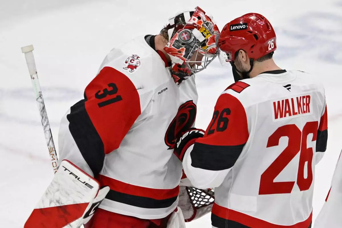 Carolina Hurricanes goalie Frederik Anderson (31) celebrates with teammate Sean Walker (26) after defeating the Chicago Blackhawks in an NHL hockey game in Chicago, Thursday, April 9, 2026. (AP Photo/Paul Beaty)