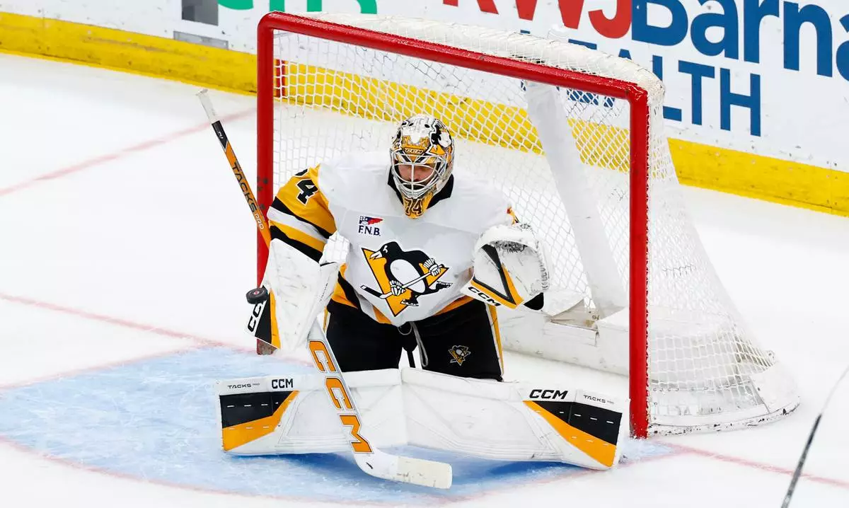Pittsburgh Penguins goaltender Stuart Skinner makes a save against the New Jersey Devils during the third period of an NHL hockey game, Thursday, April 9, 2026, in Newark, N.J. (AP Photo/Noah K. Murray)
