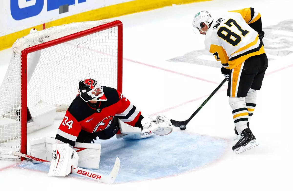 New Jersey Devils goaltender Jake Allen (34) defends against a shot by Pittsburgh Penguins center Sidney Crosby (87) during the third period of an NHL hockey game, Thursday, April 9, 2026, in Newark, N.J. (AP Photo/Noah K. Murray)