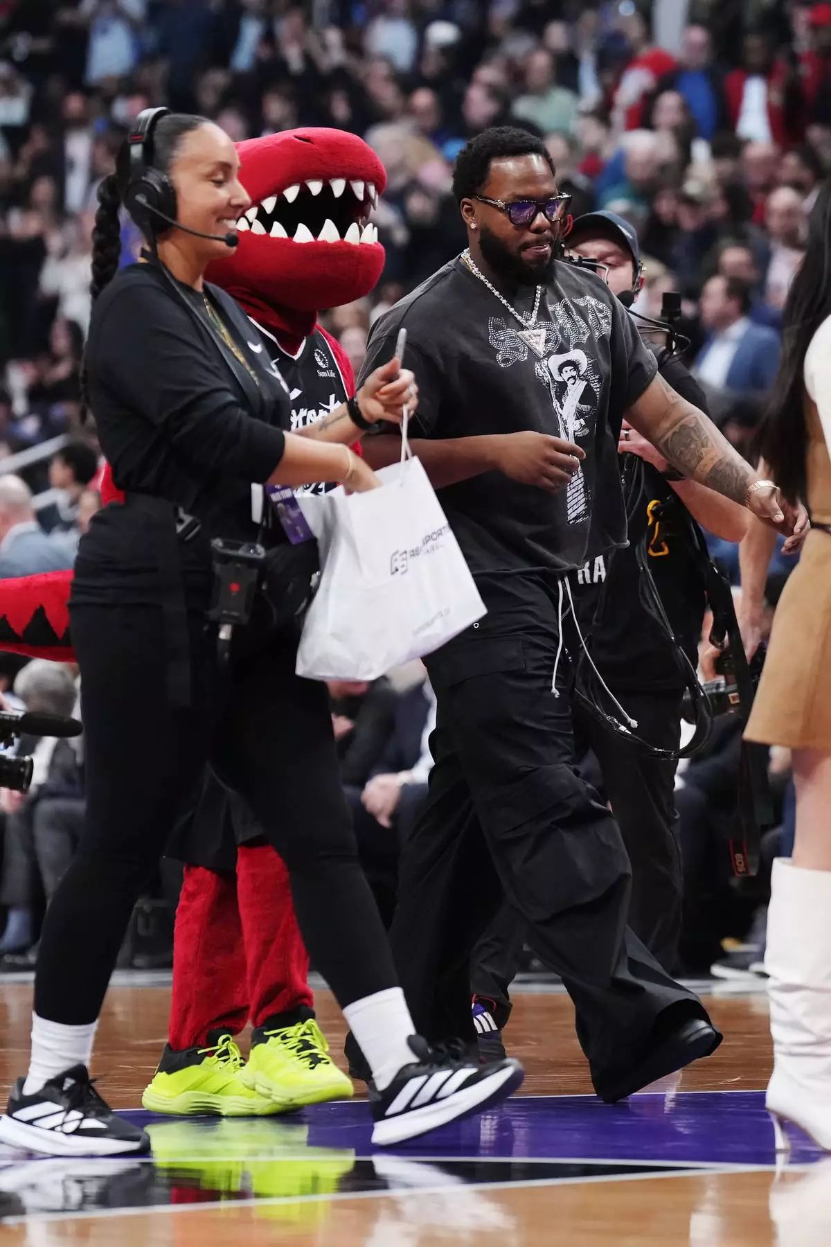 Toronto Blue Jays' Vladimir Guerrero Jr., right, makes an appearance during first-half NBA basketball game action between the Toronto Raptors and the Miami Heat in Toronto, Ontario, Thursday, April 9, 2026. (Nathan Denette/The Canadian Press via AP)