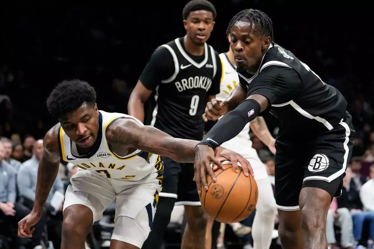 Indiana Pacers guard Kam Jones (7) fights for control of the ball with Brooklyn Nets forward Trevon Scott (13) during the first half of an NBA basketball game, Thursday, April 9, 2026, in New York. (AP Photo/Yuki Iwamura)
