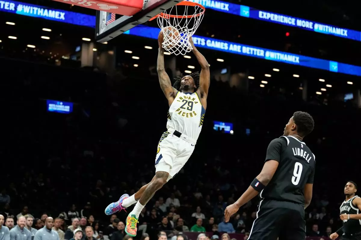 Indiana Pacers guard Quenton Jackson (29) dunks during the first half of an NBA basketball game against Brooklyn Nets, Thursday, April 9, 2026, in New York. (AP Photo/Yuki Iwamura)