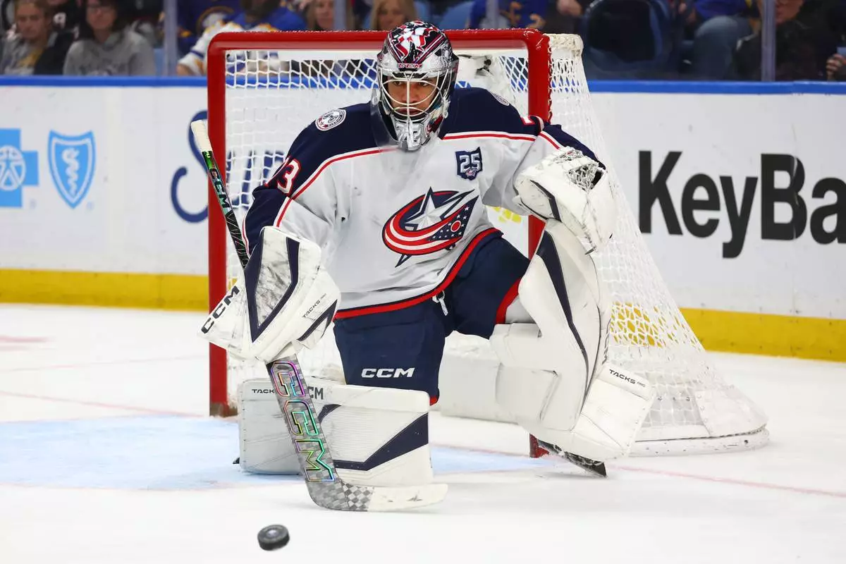Columbus Blue Jackets goaltender Jet Greaves (73) makes a save during the first period of an NHL hockey game against the Buffalo Sabres Thursday, April 9, 2026, in Buffalo, N.Y. (AP Photo/Jeffrey T. Barnes)