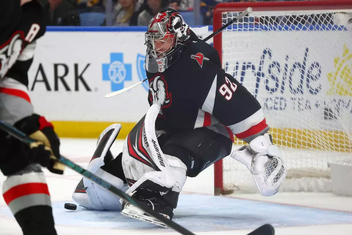 Buffalo Sabres goaltender Colten Ellis (92) makes a save during the second period of an NHL hockey game against the Columbus Blue Jackets, Thursday, April 9, 2026, in Buffalo, N.Y. (AP Photo/Jeffrey T. Barnes)