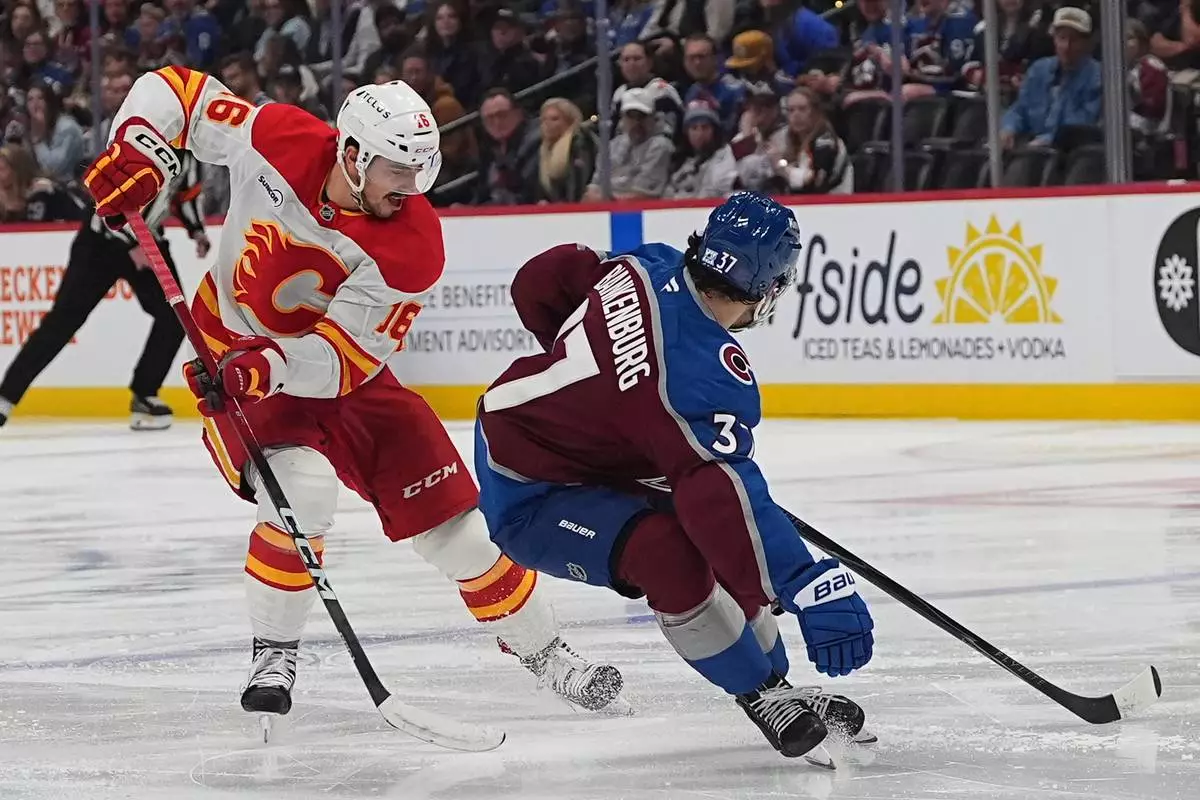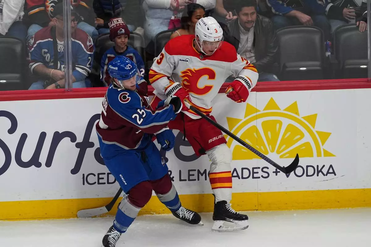 Calgary Flames center Morgan Frost, left, loses control of the puck to Colorado Avalanche defenseman Nick Blankenburg in the second period of an NHL hockey game Thursday, April 9, 2026, in Denver. (AP Photo/David Zalubowski)