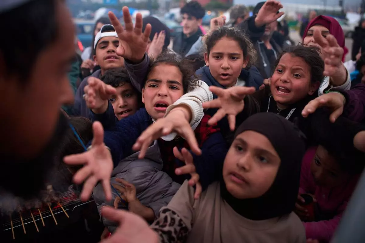 Displaced families extend their hands while waiting for donated food beside the tents they use as shelters after fleeing Israeli bombardment in southern Lebanon, in Beirut, Lebanon, Thursday, April 9, 2026. (AP Photo/Emilio Morenatti)