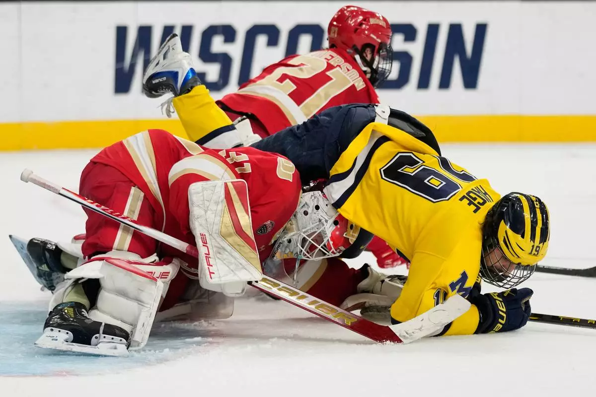 Josh Eernisse, Jayden Perron and T.J. Hughes each scored for Michigan, with Hughes' goal giving the Hobey Baker finalist 179 career points, tops among active players. Jack Ivankovic saved 22 shots.