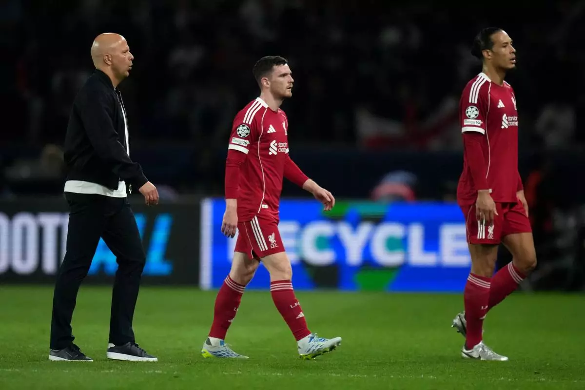 Liverpool's manager Arne Slot, left, and Andrew Robertson, center, and Virgil van Dijk leave the field after the Champions League quarterfinal first leg soccer match between Paris Saint-Germain and Liverpool in Paris, Wednesday, April 8, 2026. (AP Photo/Thibault Camus)