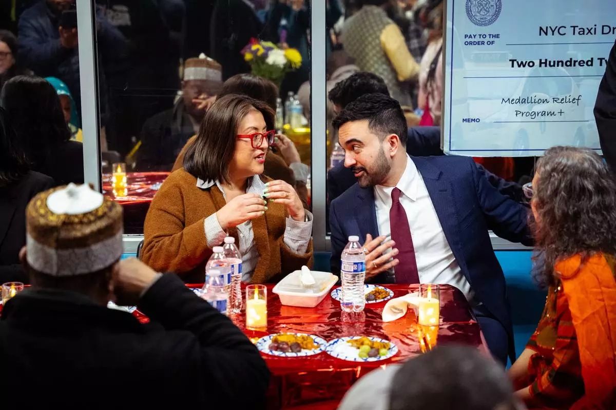 FILE - New York City Mayor Zohran Mamdani speaks with Midori Valdivia, Chair of Taxi and Limousine Commission, at a Ramadan Iftar hosted by his team at the New York Taxi Workers Association, March 18, 2026, in New York. (AP Photo/Angelina Katsanis, File)