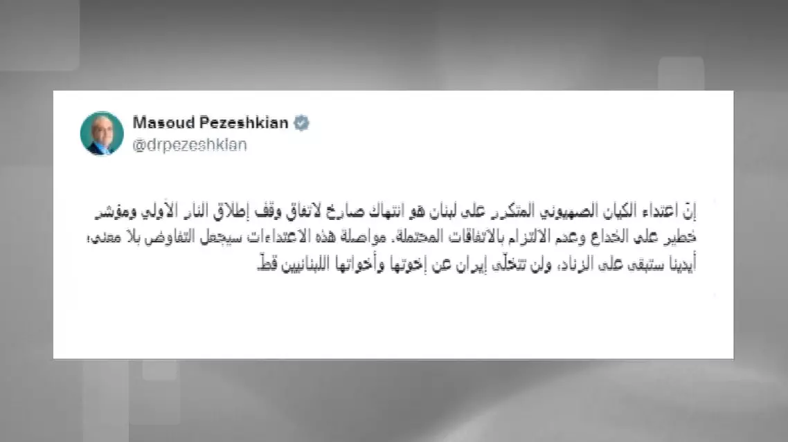 Iranian President Masoud Pezeshkian on Thursday condemned Israel's renewed military operations in Lebanon, calling them a flagrant breach of the preliminary ceasefire and a threat to ongoing negotiations.