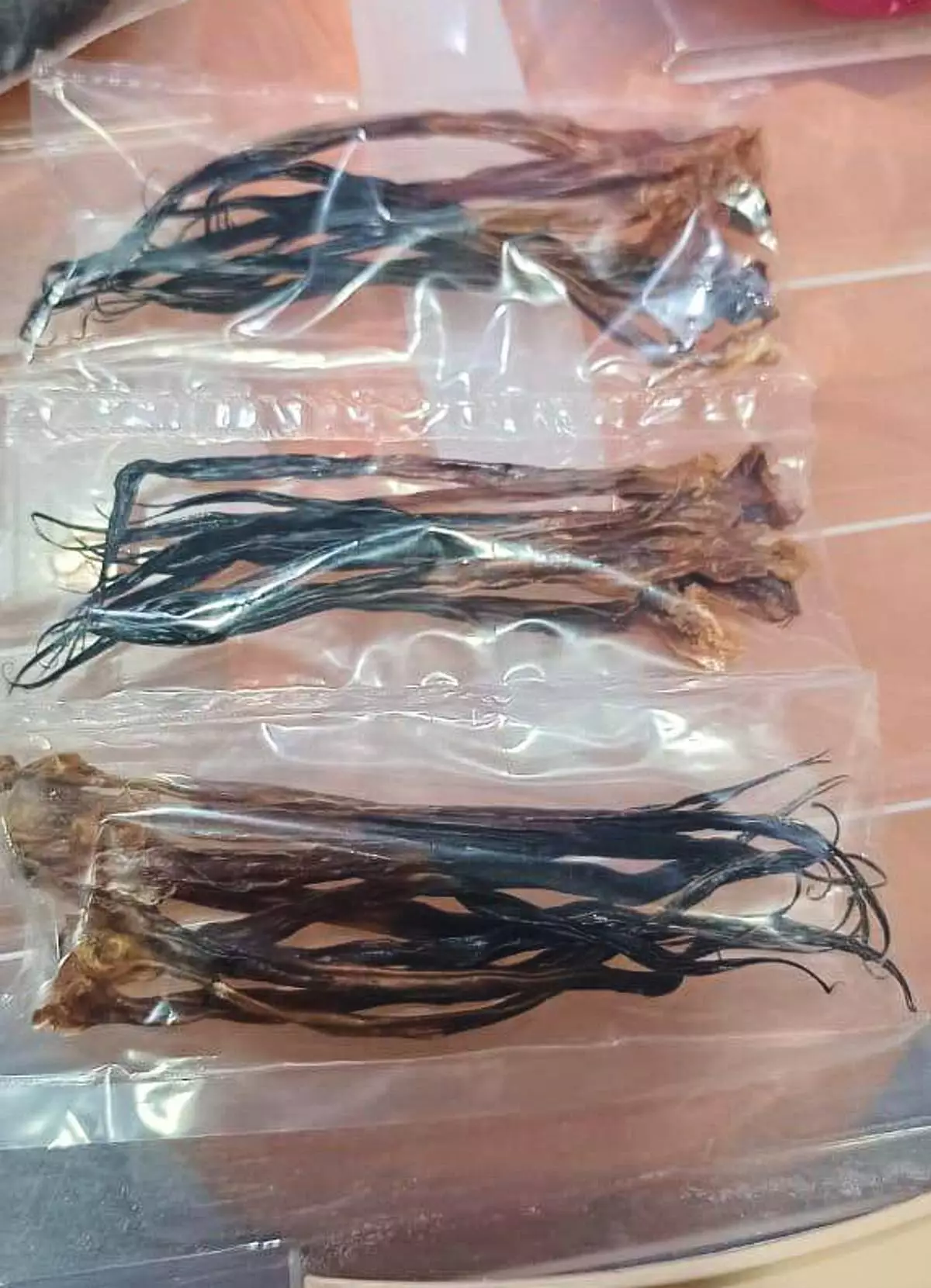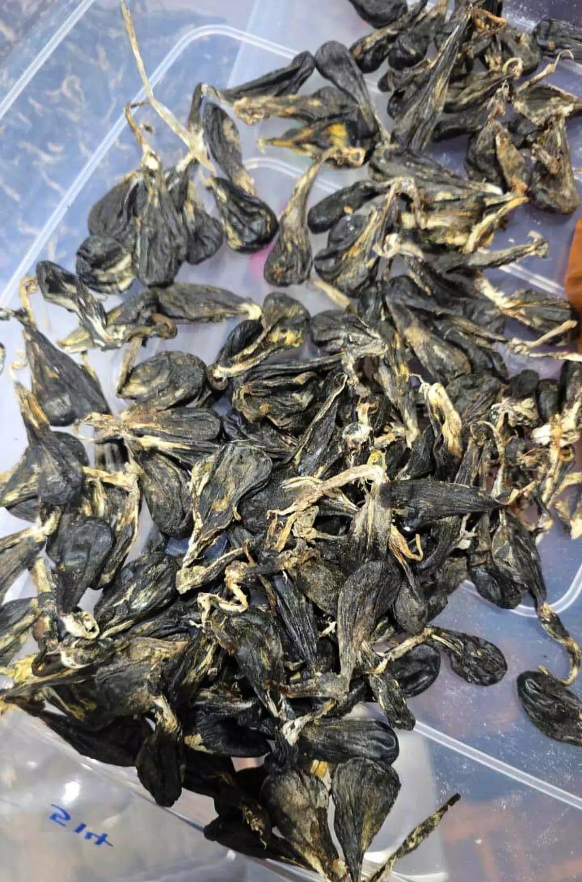 In this handout picture provide by Malaysia Wildlife Department on Saturday, April 14, 2026, python gallbladders are seen after a seizure of wildlife parts in Johor, Malaysia. (Malaysia Wildlife Department via AP)