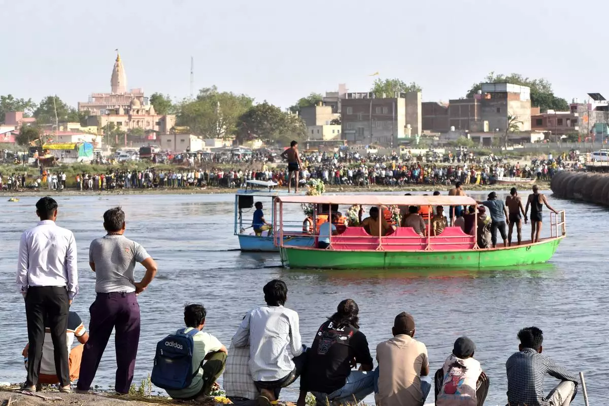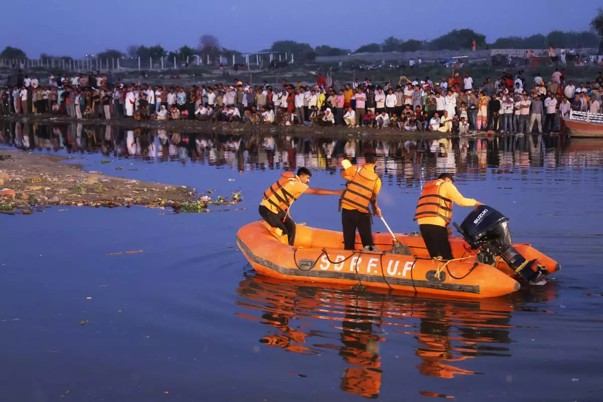 Rescuers search the site where a boat carrying pilgrims capsized in the Yamuna river in Vrindavan, India, Friday, April 10, 2026. (AP Photo)