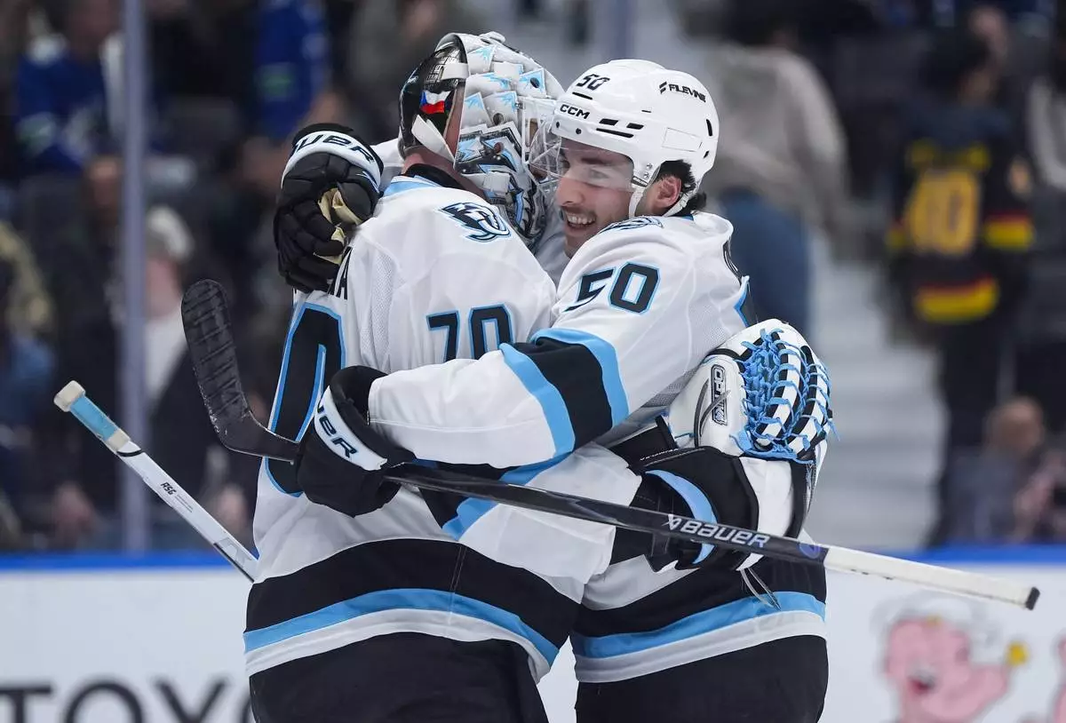 Utah Mammoth's Sean Durzi (50) and goalie Karel Vejmelka (70) celebrate after Utah defeated the Vancouver Canucks in an NHL hockey game, in Vancouver, British Columbia, Saturday, April 4, 2026. (Darryl Dyck/The Canadian Press via AP)