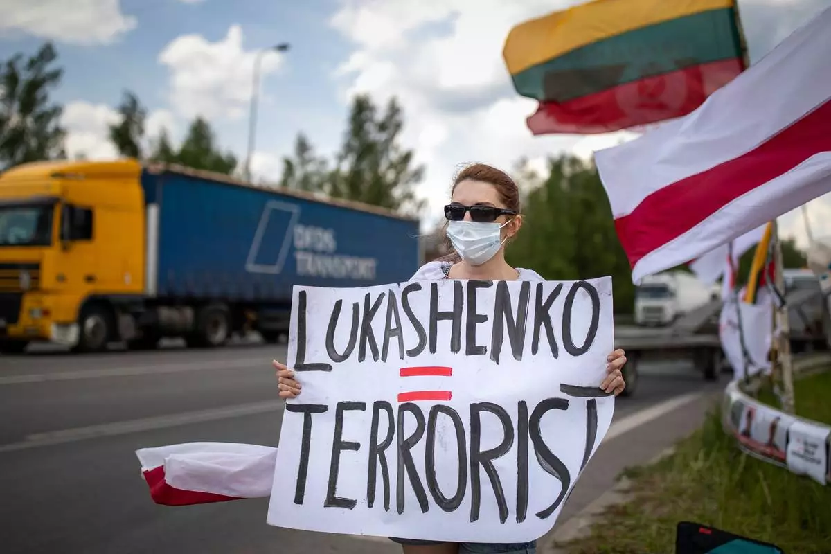 FILE - A protester holds a banner, old Belarusian and Lithuanian national flags during a protest demanding freedom for political prisoners in Belarus near Medininkai, Lithuanian-Belarusian border crossing point east of Vilnius, Lithuania, Tuesday, June 8, 2021. (AP Photo/Mindaugas Kulbis, File)