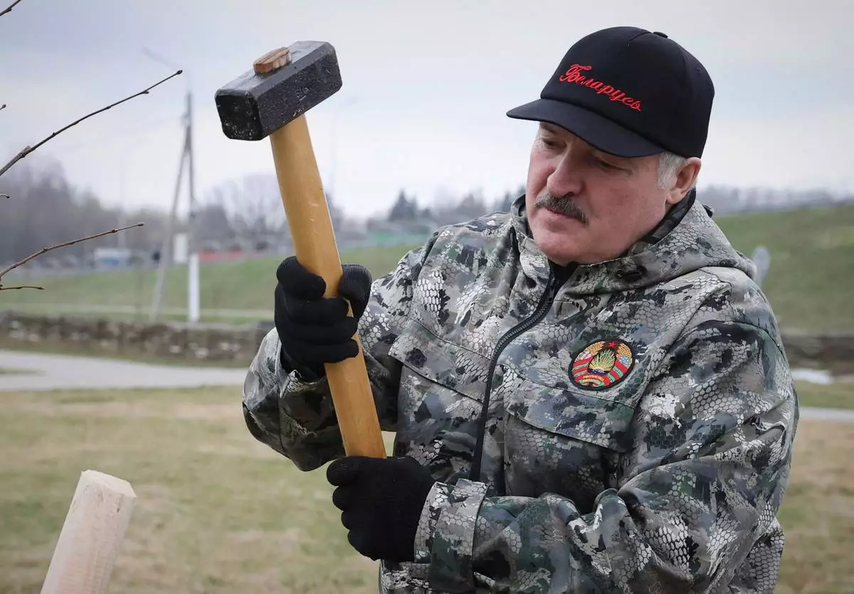 FILE - Belarus President Alexander Lukashenko plants young trees during a subbotnik, a Soviet-style Clean-up Day, in the village of Alexandria, Belarus, Saturday, April 17, 2021. (Maxim Guchek/BelTA Pool Photo via AP, File)