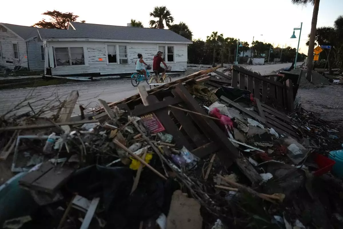FILE - People bike past damaged homes and debris left by Hurricane Milton, on the sand-coated main road of southern Manasota Key, already cleared of feet of sand, in Englewood, Fla., Oct. 13, 2024. (AP Photo/Rebecca Blackwell, File)