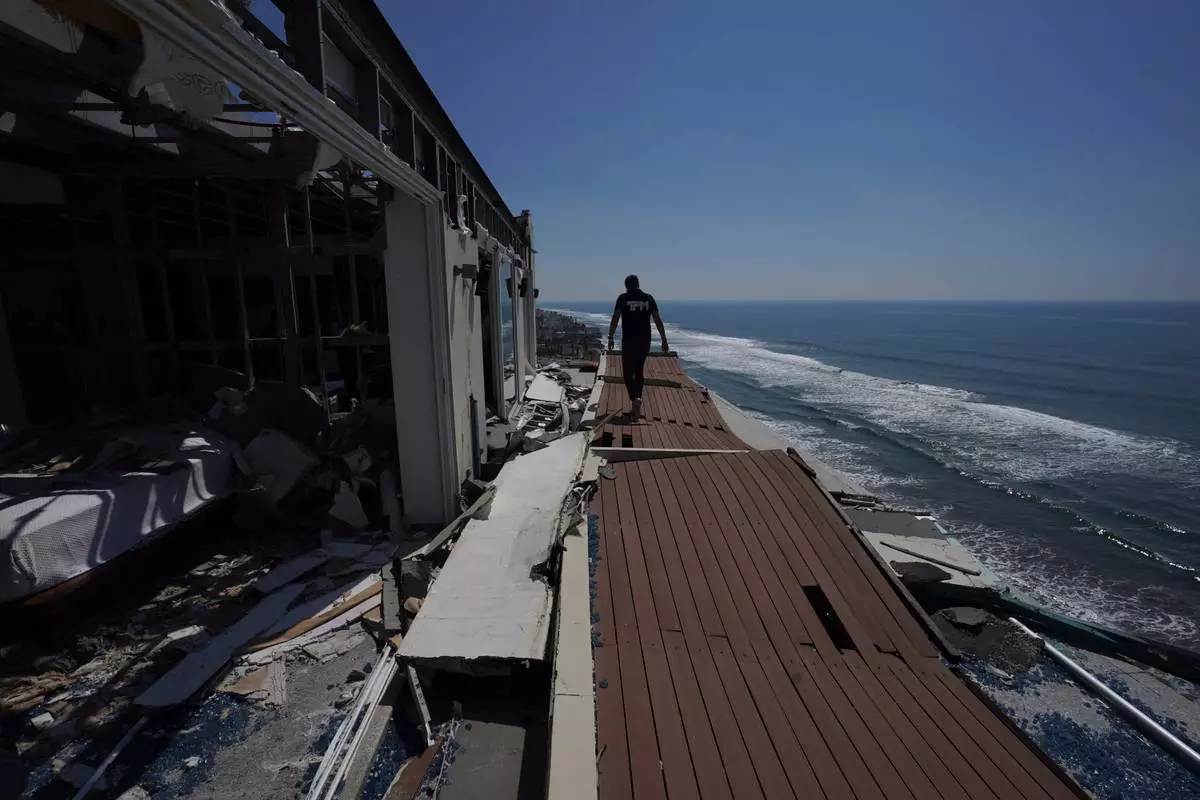 FILE - A man walks alongside damaged apartments in the aftermath of Hurricane Otis, in the Diamonds subdivision of Acapulco, Mexico, Nov. 9, 2023. (AP Photo/Marco Ugarte, File)