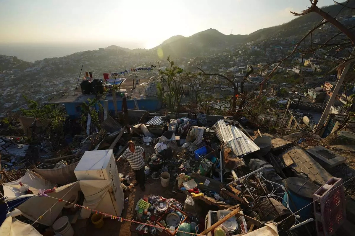 FILE - Jaime Sosa stands amid the ruins of his home nearly three weeks after Hurricane Otis hit as a Category 5 storm in the Alta Cuauhtemoc area of Acapulco, Mexico, Nov. 9, 2023. (AP Photo/Marco Ugarte, File)