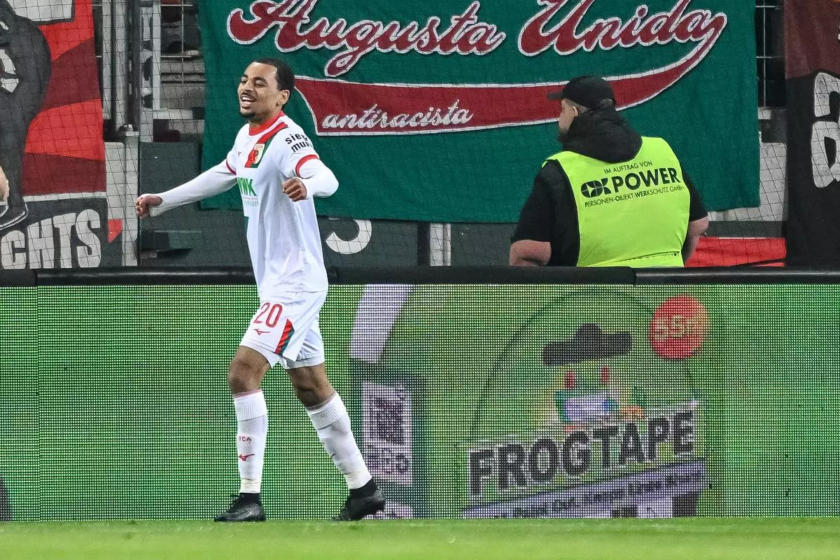 Augsburg's Alexis Claude-Maurice celebrates after scoring during the German Bundesliga soccer match between FC Augsburg and TSG 1899 Hoffenheim in Augsburg, Germany, Friday, April 10, 2026. (Harry Langer/dpa via AP)
