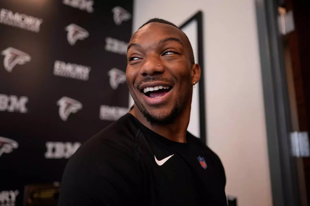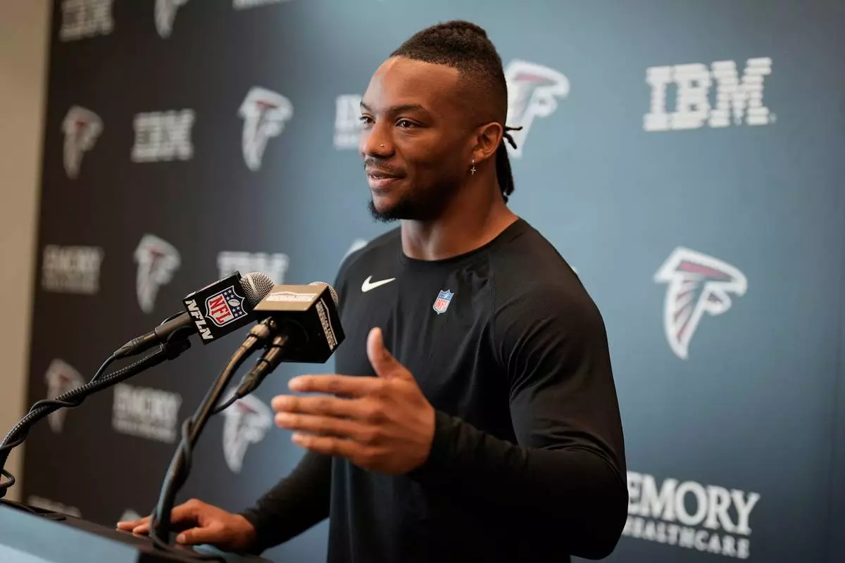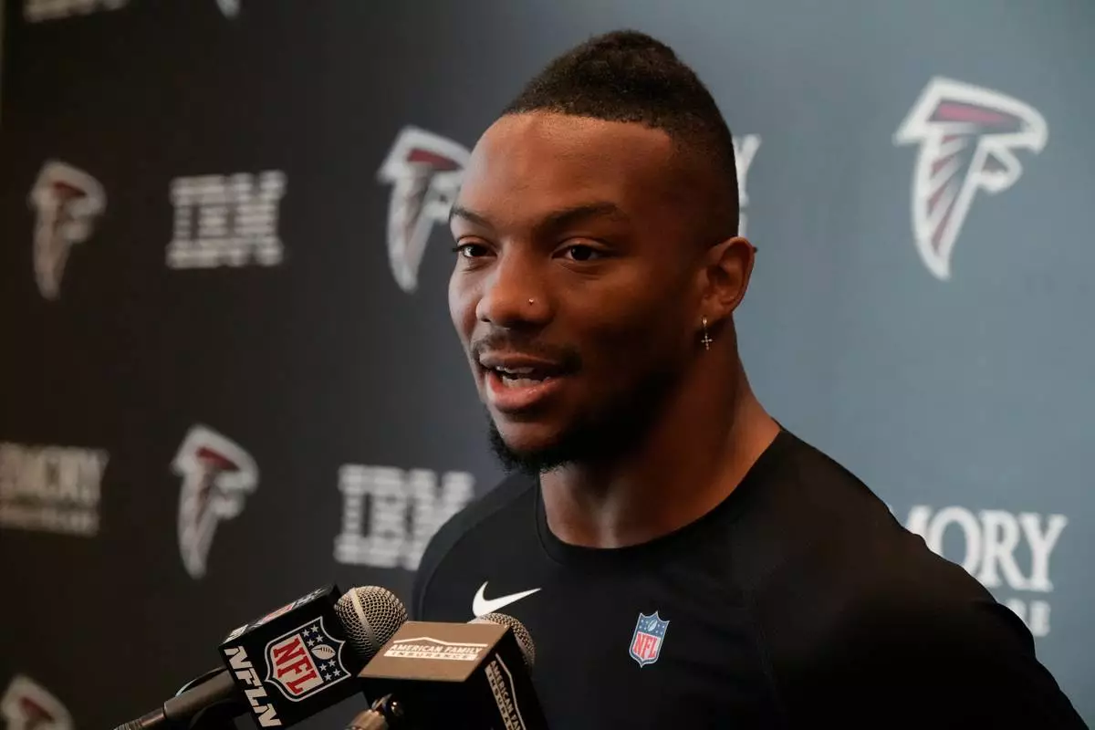 Atlanta Falcons running back Bijan Robinson speaks during an Atlanta Falcons NFL media availability, Wednesday, April 8, 2026, in Flowery Branch, Ga. (AP Photo/Mike Stewart)