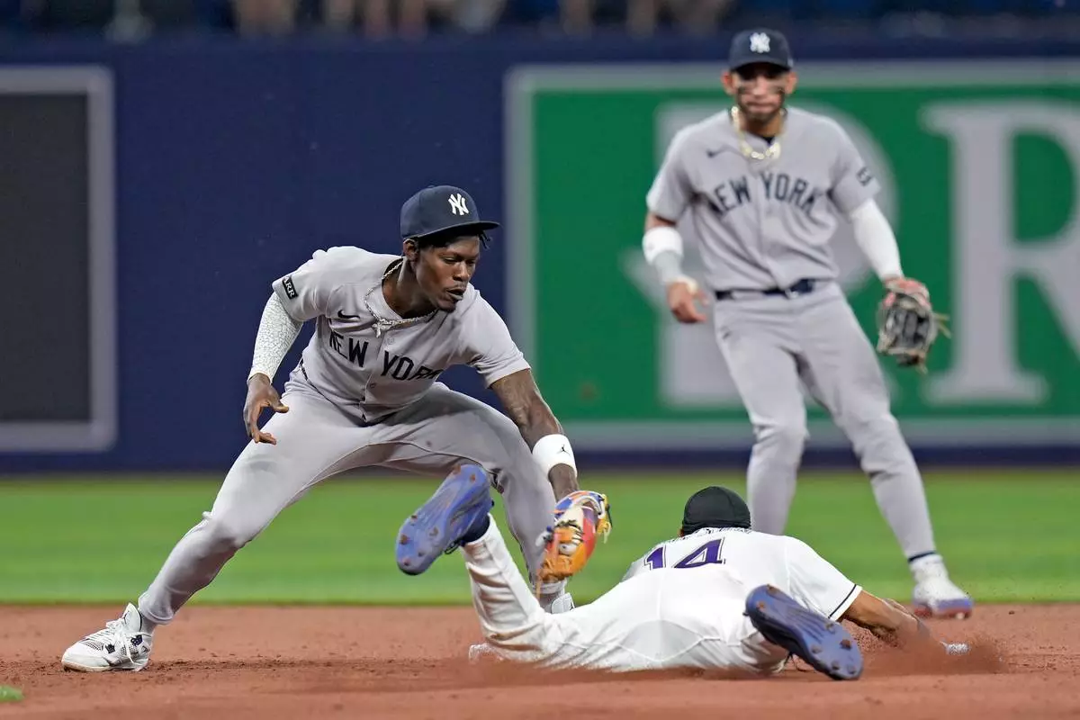 New York Yankees second baseman Jazz Chisholm Jr. tags out Tampa Bay Rays' Chandler Simpson (14) attempting to steal second base during the eighth inning of a baseball game Friday, April 10, 2026, in St. Petersburg, Fla. (AP Photo/Chris O'Meara)