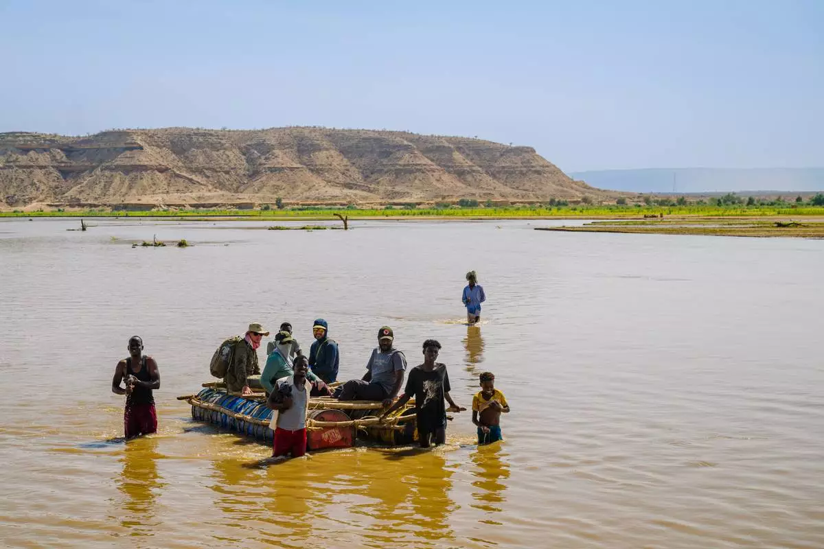 Myrrh researchers cross the Shebelle River with the help of boatmen that wade in the low levels instead of paddling as they make their way toward East Imi, Ethiopia, Saturday Jan. 10, 2026. (AP Photo/Julianne Gauron)