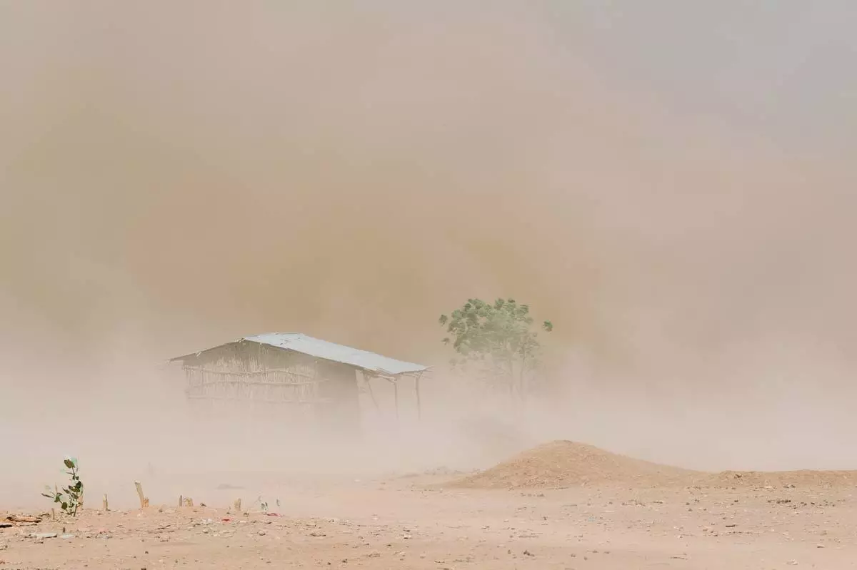 Dust engulfs a home and a tree that are barely visible amid a drought on Friday, Jan. 9, 2026, in Sanqotor, Ethiopia. (AP Photo/Julianne Gauron)