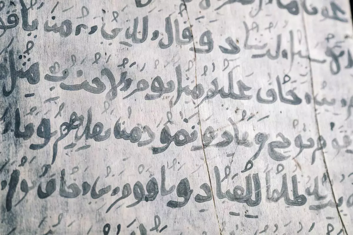 An example of text from the Quran, written on a wooden tablet with myrrh ink, is displayed Thursday Jan. 8, 2026, in Sanqotor, Ethiopia. (AP Photo/Julianne Gauron)
