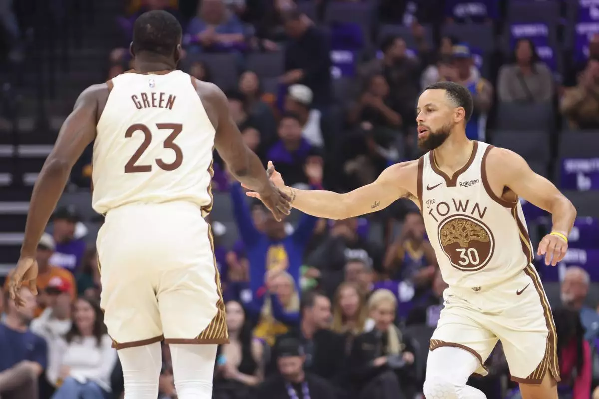 Golden State Warriors guard Stephen Curry (30) high fives Golden State Warriors forward Draymond Green (23) making a three point basket during the first half of an NBA basketball game against the Sacramento Kings, Friday, April 10, 2026, in Sacramento, Calif. (AP Photo/Scott Marshall)