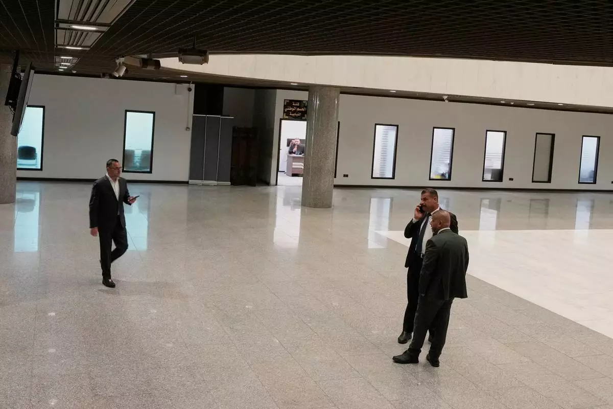 Guards prepare for the arrival of Parliament members at the parliament building hall to elect the President of the Republic, in Baghdad, Iraq, Saturday, April11, 2026. (AP Photo/Hadi Mizban)