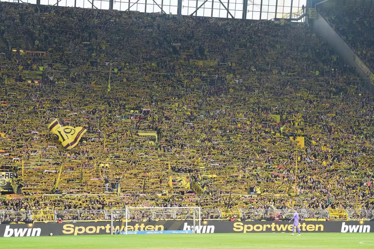 Dortmund' supporters wave their flags during the German Bundesliga soccer match between Borussia Dortmund and Bayer Leverkusen in Dortmund, Germany, Saturday, April 11, 2026. (AP Photo/Martin Meissner)