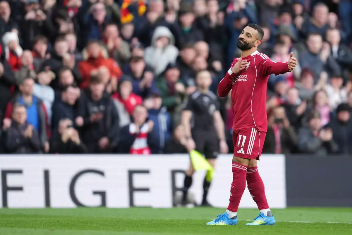 Liverpool's Mohamed Salah celebrates after scoring his side's second goal during the English Premier League soccer match between Liverpool and Fulham in Liverpool, England, Saturday, April 11, 2026. (AP Photo/Jon Super)