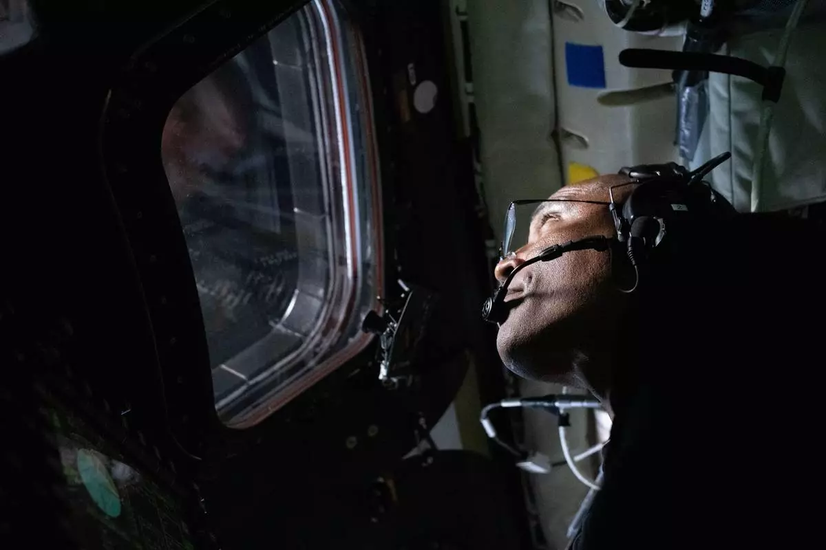 In this image provided by NASA, Artemis II Pilot Victor Glover is photographed in the Orion spacecraft during the Artemis II lunar flyby on Monday, April 6, 2026. (NASA via AP)