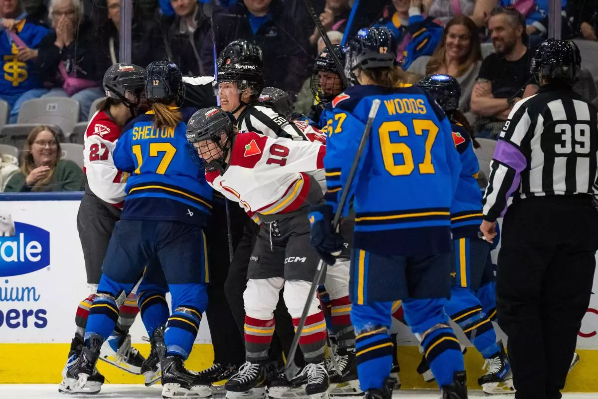 A fight breaks out between the Toronto Sceptres and the Ottawa Charge after the third period during PWHL hockey game action in Toronto, Saturday, April 11, 2026. (Arlyn McAdorey/The Canadian Press via AP)