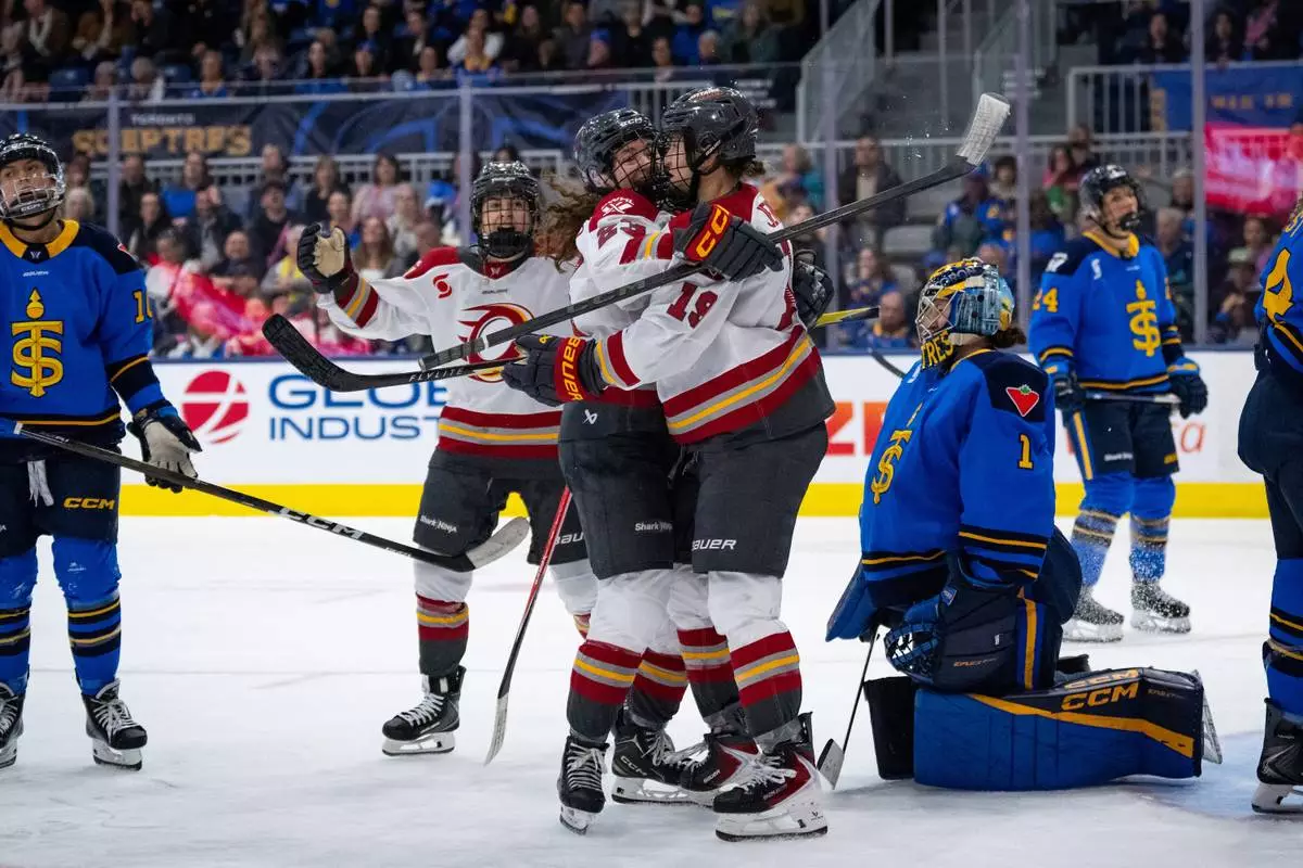 Ottawa Charge forward Brianne Jenner (19) celebrates with teammates after her goal against Toronto Sceptres goaltender Raygan Kirk (1) during third-period PWHL hockey game action in Toronto, Saturday, April 11, 2026. (Arlyn McAdorey/The Canadian Press via AP)