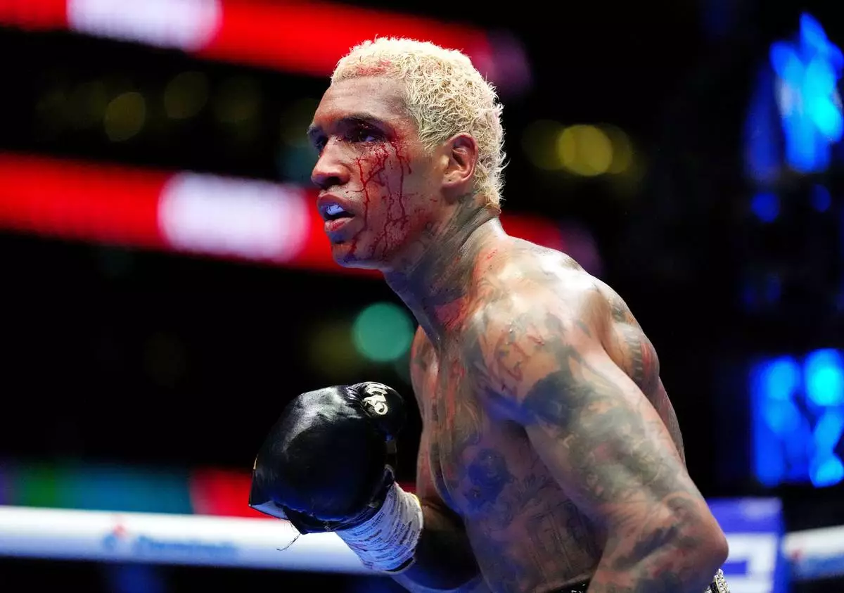 Boxers Conor Benn's face is bloodied during welterweight bout Regis Prograis at Tottenham Hotspur Stadium in London, Saturday, April 11, 2026. (Bradley Collyer/PA via AP)